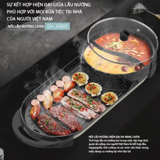 – LIVEN SK-J6860 là một chiếc bếp đa năng, với thiết kế gồm 1 nồi lẩu dung tích 3.6L và 1 khay nướng kích thước lớn. Kết cấu vô cùng hợp lý này giúp đáp ứng đầy đủ nhu cầu thưởng thức trong mọi bữa tiệc tại gia từ 2-10 người.